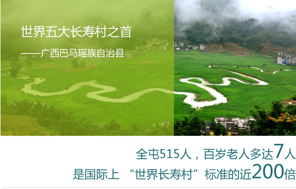 廣西巴馬瑤族自治縣位于廣西盆地和云貴高原的斜坡地帶,總?cè)丝?3萬人。據(jù)廣西巴馬縣民政局消息,截止到2010年6月8日,廣西巴馬瑤族自治縣100歲及以上的長壽老人達(dá)87人,每10萬人里有37.826個,是國際長壽村標(biāo)準(zhǔn)的5.043倍。比2000年第五次全國人口普查時74人多13人。是世界五大村中惟一長壽老人不斷增多的地方。被譽(yù)為世界五大長壽村之首。其中,一個叫甲篆鄉(xiāng)平安村巴盤屯的地方,全屯515人,百歲老人多達(dá)7人,是國際上 “世界長壽村”標(biāo)準(zhǔn)的近200倍。