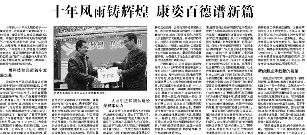 報道從公司的科研成果、改革創(chuàng)新精神、人才引進和團隊建設、主題活動、未來憧憬等方面,反映了公司成立10年來所取得的一系列驕人業(yè)績和公司發(fā)展過程中形成并堅持的品質精神、價值理念、管理運營模式。這是該報為公司10周年華誕送上的一份大禮,必將激勵全體康姿百德人在新的起點上振奮精神、開拓進取,取得新的更大的業(yè)績。