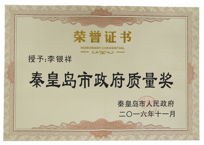 “秦皇島市政府質(zhì)量獎(jiǎng)”證書