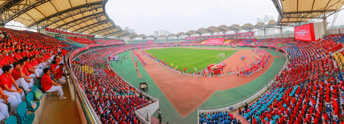 在賽場(chǎng)上,參賽隊(duì)員們或身著簡(jiǎn)約時(shí)尚的運(yùn)動(dòng)服,或身著絢麗多彩的民族服飾,在環(huán)形的奧體中心舞動(dòng)成了一道流動(dòng)風(fēng)景,渲染出一派盛世歡歌的壯美景象。