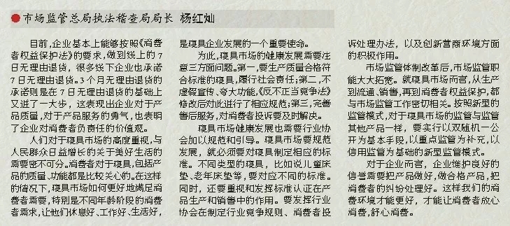 為此,寢具市場的健康發(fā)展需要注意三方面問題。第一,要生產(chǎn)質(zhì)量合格符合標準的寢具,履行社會責任;第二,不虛假宣傳、夸大功能,《反不正當競爭法》修改后對此進行了相應規(guī)范;第三,完善售后服務,對消費者投訴要及時解決。
