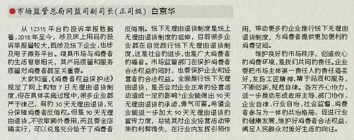 大家知道,《消費者權(quán)益保護法》規(guī)定了網(wǎng)上購物7日無理由退貨制度,但在具體實施過程中,很多企業(yè)都嚴于律己,有的30天無理由退貨,充分保障消費者反悔權(quán)。但是90天無理由退貨,不收取額外費用,而且要全店鋪實行,可以說是充分給予了消費者反悔期。線下無理由退貨制度是線上無理由退貨制度的延伸,目前很多企業(yè)都在自覺踐行線下無理由退貨制度,這是社會的進步,也是廣大消費者的福音。市場監(jiān)管部門在保護消費者合法權(quán)益的同時,也要保護企業(yè)和經(jīng)營者的合法權(quán)益。全面推行線下無理由退貨,是否會對企業(yè)正常的經(jīng)營活動造成一定的影響?企業(yè)能做出90天無理由退貨的承諾,勇氣可嘉。希望企業(yè)能進一步加大90天無理由退貨的宣傳力度,總結(jié)其對企業(yè)經(jīng)營活動帶來的利弊得失,在行業(yè)內(nèi)發(fā)揮引領作用,帶動更多的企業(yè)推行線下無理由退貨制度,為消費者提供更加便利的消費空間。