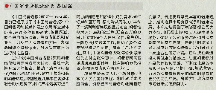 實際上,康姿百德公司今天提出的3個月無理由退貨,也是一個創(chuàng)新機遇的模式。今天的社會,任何一個企業(yè)和企業(yè)家都不可能獨善其身,我們需要把資本、信用、新型商業(yè)模式和“互聯(lián)網(wǎng)+”深度融合。中國消費者報社舉辦本次座談會,正是搭建了一個平臺,為中國千千萬萬的企業(yè)家護航,在為千千萬萬的消費者保駕。