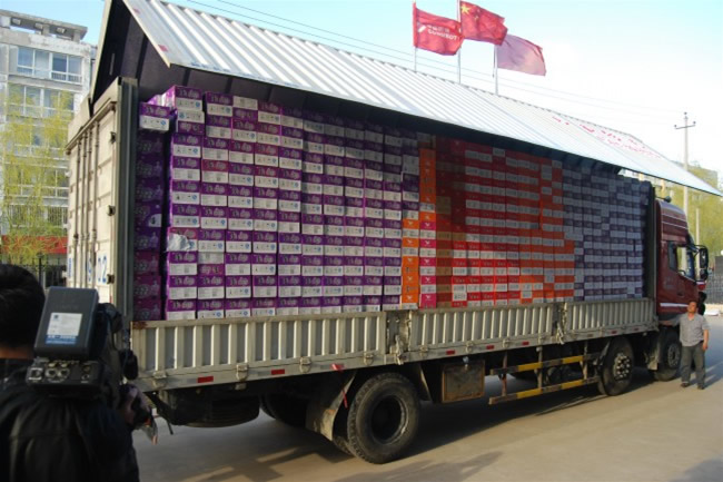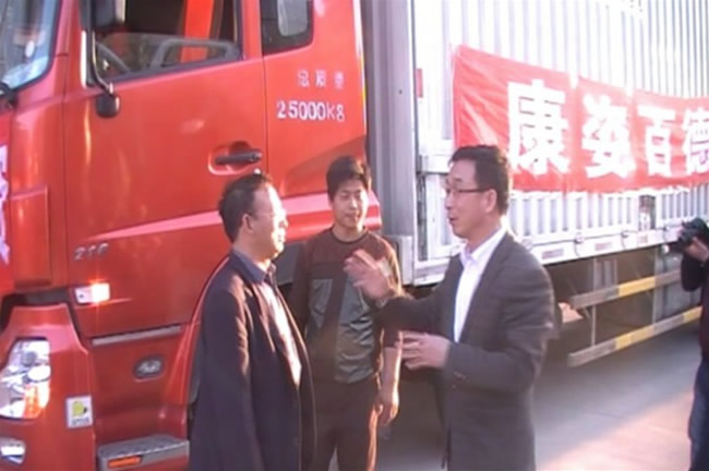 25日上午9點(diǎn),物資車到達(dá)石家莊。石家莊康姿百德總代理李志華,代表新華區(qū)、裕華區(qū)、橋西區(qū)、橋東區(qū)、長安區(qū)、開發(fā)區(qū)、辛集市、平山縣、藁城縣、正定縣等地的代理商將愛心物資裝上貨車
