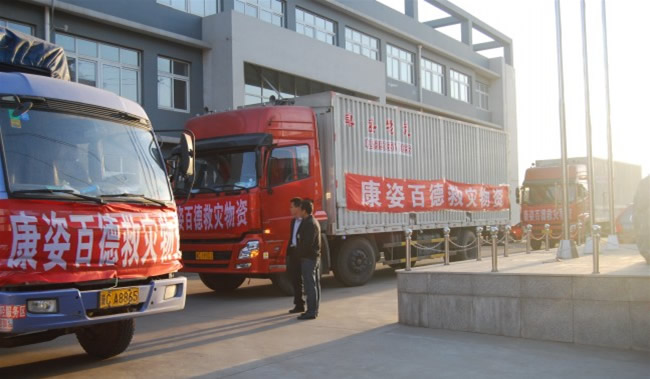 滿救災(zāi)物資的貨車離開康姿百德公司,駛向?yàn)?zāi)區(qū) “捎去我的愛心,帶上我的祝?!?/strong> “回饋社會,造福人類”,始終是康姿百德公司秉承的經(jīng)營理念。全國各地的康姿百德經(jīng)銷商在把幸福和健康帶給人們的同時,也深知自己身上的責(zé)任,不忘奉獻(xiàn)自己的愛心。他們積極捐款捐物,向?yàn)?zāi)區(qū)人民伸出援助之手。物資車途經(jīng)北京、河北、山西、河南等地時,當(dāng)?shù)亟?jīng)銷商囑咐司機(jī)一定把這份愛心物資安全送到災(zāi)區(qū), “捎去我的愛心,帶上我的祝?!保@是康姿百德人最強(qiáng)烈的心聲。