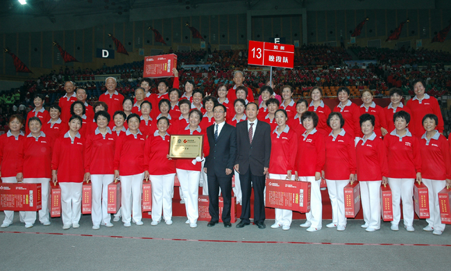 中國消費(fèi)者協(xié)會副會長母建華、康姿百德公司董事長李銀祥與健身操比賽一等獎獲得者山東濱州晚霞隊隊員合影