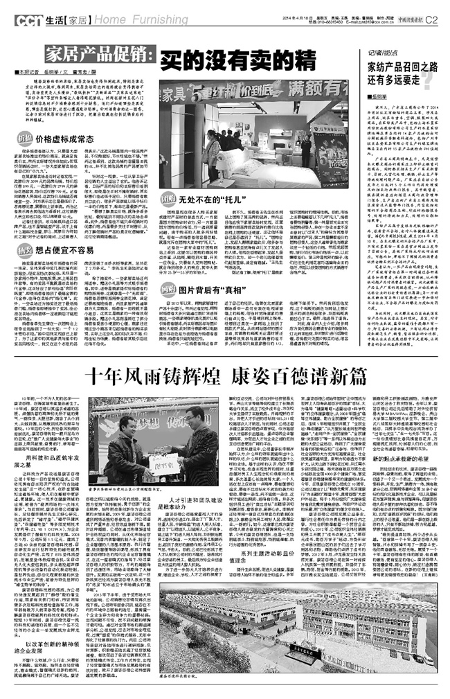 在康姿百德公司成立10周年之際,《中國消費(fèi)者報(bào)》2014年4月18日C2版,用1/2的版面對(duì)康姿百德公司10年來的發(fā)展情況進(jìn)行了客觀系統(tǒng)的報(bào)道。 報(bào)道從公司的科研成果、改革創(chuàng)新精神、人才引進(jìn)和團(tuán)隊(duì)建設(shè)、主題活動(dòng)、未來憧憬等方面,反映了公司成立10年來所取得的一系列驕人業(yè)績和公司發(fā)展過程中形成并堅(jiān)持的品質(zhì)精神、價(jià)值理念、管理運(yùn)營模式。這是該報(bào)為公司10周年華誕送上的一份大禮,必將激勵(lì)全體康姿百德人在新的起點(diǎn)上振奮精神、開拓進(jìn)取,取得新的更大的業(yè)績。