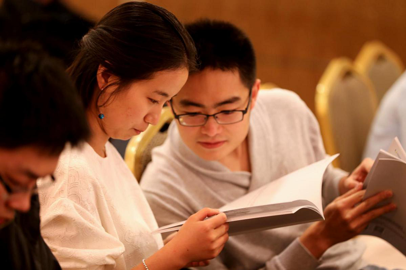 早早來到宣講會現(xiàn)場,并領(lǐng)取公司招聘宣傳冊的北大學(xué)子。