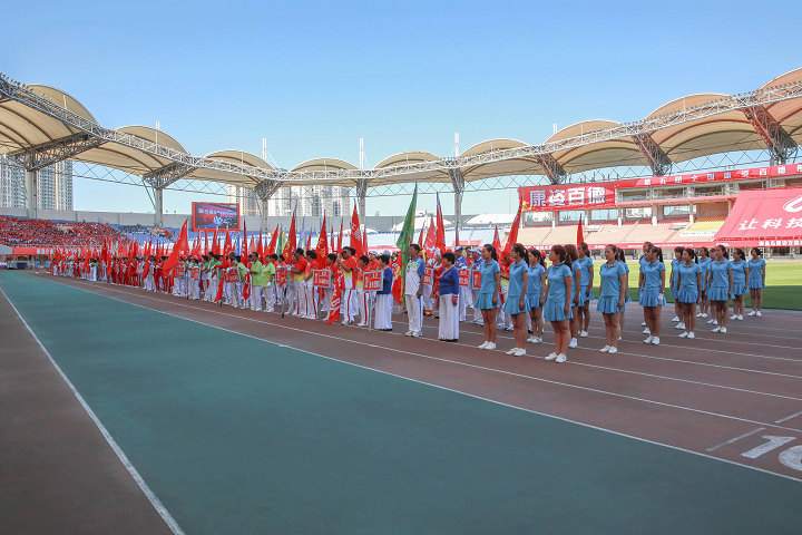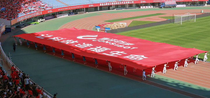 大賽初始,伴隨著激動(dòng)人心的音樂, 一幅608平方米的巨型康姿百德紅旗步入賽場(chǎng),康姿百德91名工作人員共舉旗幟,整齊自如地緩緩前行,給人以極大的視覺沖擊。