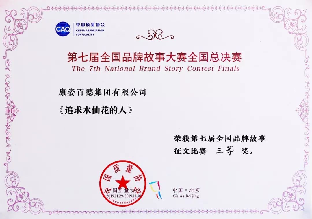 經(jīng)過全國(guó)27個(gè)分賽區(qū)、近約450個(gè)作品的激烈角逐和評(píng)選??底税俚录瘓F(tuán)憑借《追求水仙花的人》的主題征文、《質(zhì)量是企業(yè)的生命》的主題演講、《從科學(xué)家走向企業(yè)家的人生飛躍》的主題演講,從全國(guó)眾多的知名品牌故事中脫穎而出,分別斬獲了兩個(gè)三等獎(jiǎng),榮獲一項(xiàng)優(yōu)勝獎(jiǎng)。