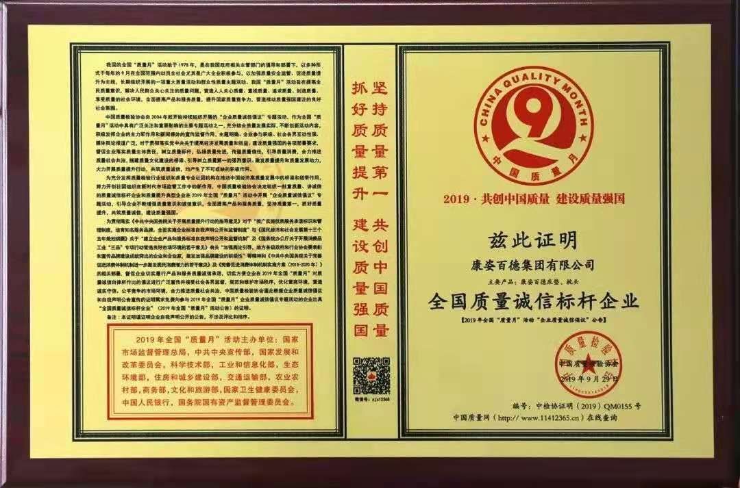 康姿百德連續(xù)多年榮獲 “全國質(zhì)量誠信標(biāo)桿企業(yè)”