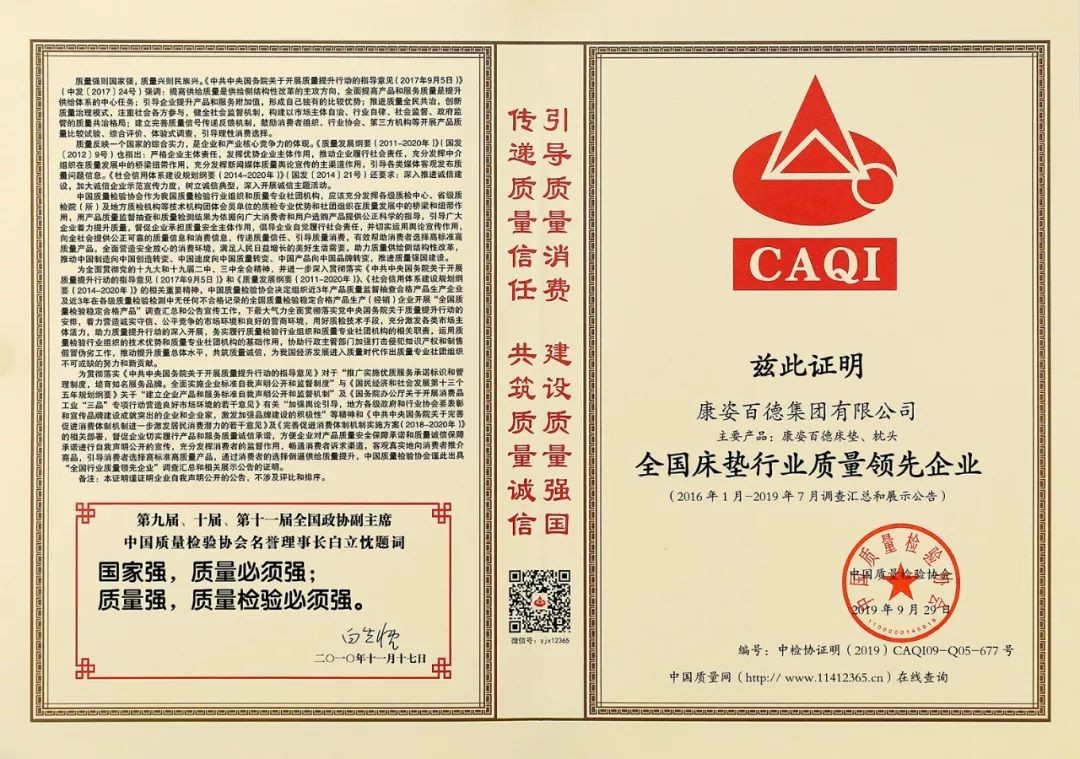 康姿百德榮獲“全國(guó)床墊行業(yè)質(zhì)量領(lǐng)先企業(yè)”
