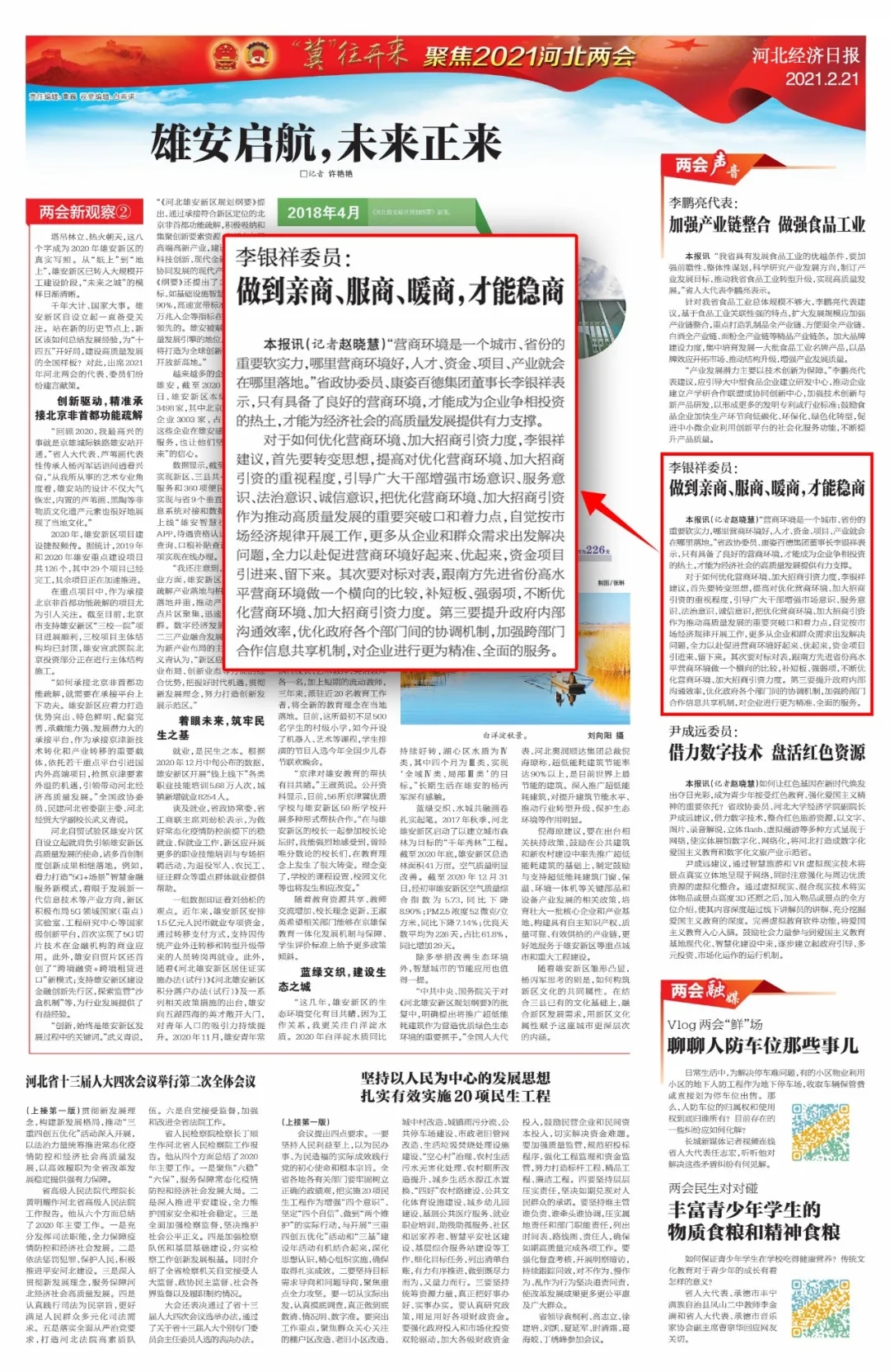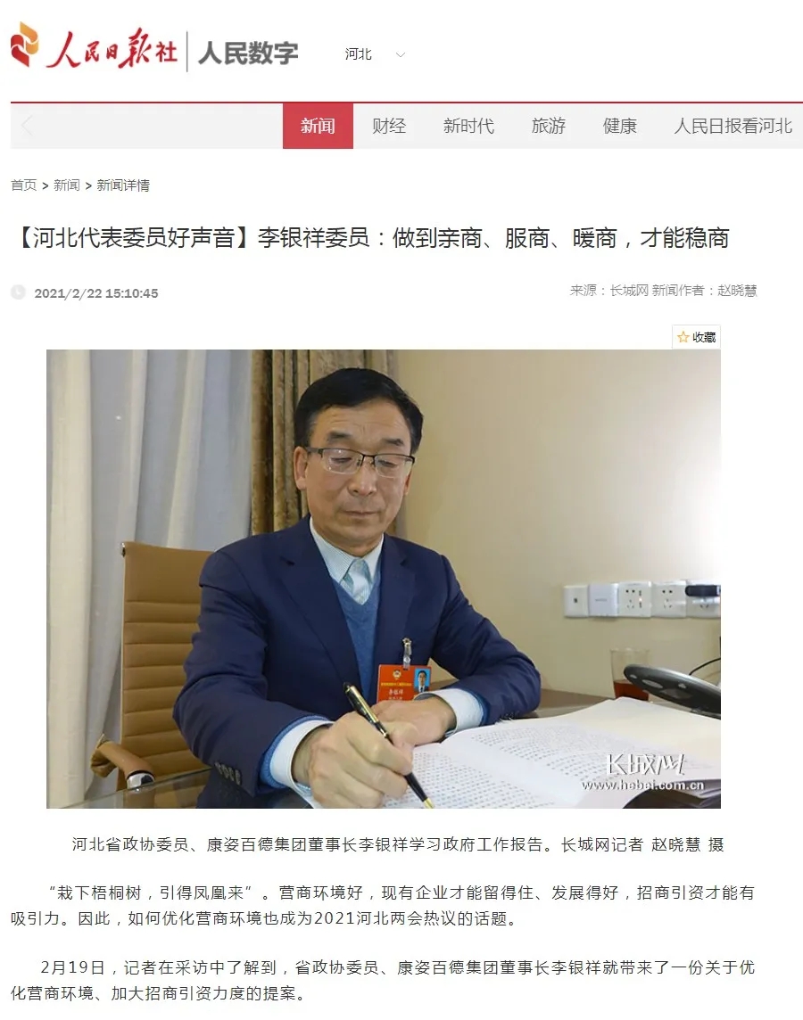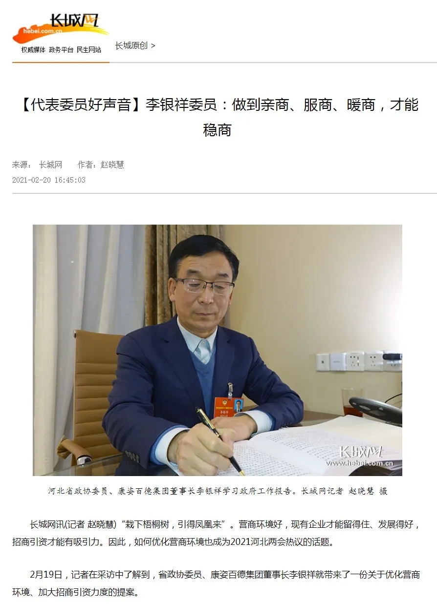 在河北省兩會政協(xié)委員駐地,李銀祥委員接受了河北經(jīng)濟日報的專訪。在受訪的過程中,李銀祥董事長針對2021河北兩會如何優(yōu)化營商環(huán)境的熱議話題,簡述了關(guān)于優(yōu)化營商環(huán)境、加大招商引資力度的提案。李銀祥董事長的提案還被刊登在了2021年2月21日的河北經(jīng)濟日報上。