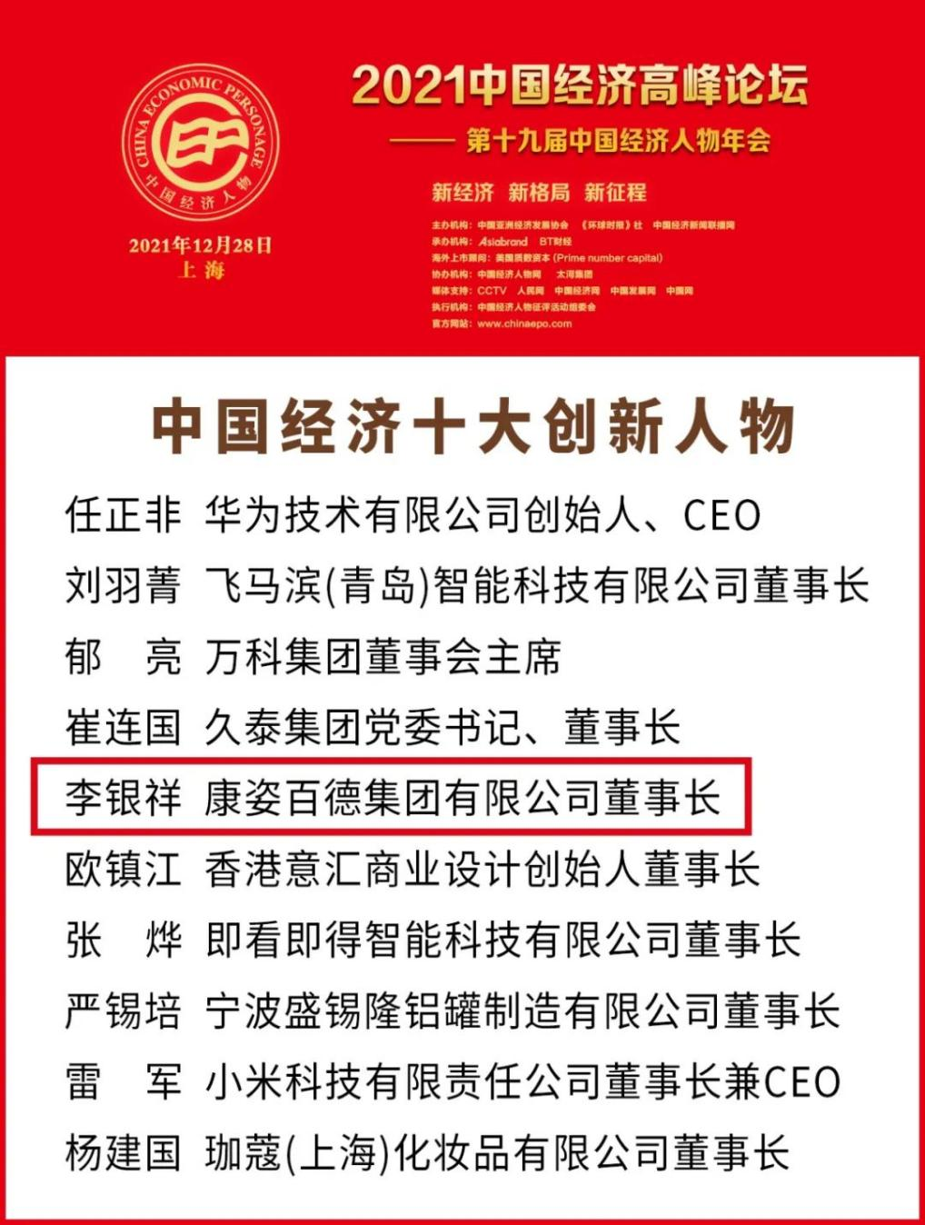 2021年12月28日,“2021中國經(jīng)濟(jì)高峰論壇暨第十九屆中國經(jīng)濟(jì)人物年會(huì)” 在上海成功舉行。本次活動(dòng)由中國經(jīng)濟(jì)新聞聯(lián)播網(wǎng)、《環(huán)球時(shí)報(bào)》社、中國亞洲經(jīng)濟(jì)發(fā)展協(xié)會(huì)聯(lián)合主辦。康姿百德集團(tuán)董事長李銀祥榮獲“中國經(jīng)濟(jì)十大創(chuàng)新人物”榮譽(yù)稱號(hào)。