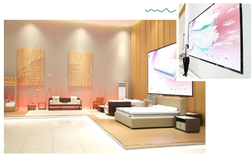 科技展廳安裝了智慧互動(dòng)屏設(shè)備,上下兩個(gè)屏幕聯(lián)動(dòng),小屏控制大屏。用手操作觸控一體機(jī),可放大至穿透產(chǎn)品,實(shí)現(xiàn)康姿百德床墊的360°模型展示。全新的互動(dòng)展示效果,讓參觀人員可以更直觀地了解康姿百德床墊的結(jié)構(gòu)。