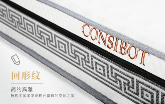 回形紋是中國傳統(tǒng)的吉祥圖案,象征著永恒和連綿不斷的生命力。康姿百德清雅款床墊圍邊用“回形紋”加以點(diǎn)綴,賦予了吉祥如意、福運(yùn)綿綿的美好寓意,展現(xiàn)了中式美學(xué)與現(xiàn)代寢具的交融之美。同時(shí)也增強(qiáng)了床墊整體的精致感。