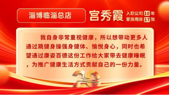 宮秀霞因康姿百德健身操與康姿百德結(jié)緣,入職后,了解到康姿百德是一家有社會(huì)責(zé)任感的公司,一直用實(shí)際行動(dòng)推動(dòng)著“健康中國(guó)”建設(shè)。