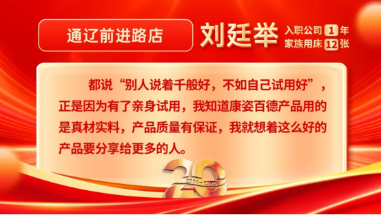 劉廷舉還說(shuō):“感謝康姿百德,讓我在這里收獲了很多親人,讓我們感受到了很多溫暖,這也讓我干著很有底氣。尤其是將這么好的產(chǎn)品介紹給親朋好友使用后,也讓我們的親情和友情更加濃厚了。現(xiàn)在,我的家人都很支持我的工作。家人們不光認(rèn)可公司,還認(rèn)可康姿百德的產(chǎn)品,目前我的家族已經(jīng)使用12張康姿百德床墊了。家人的支持和鼓勵(lì),是我最堅(jiān)實(shí)的后盾,我也有信心,在康姿百德創(chuàng)造更大的價(jià)值?!?/span>