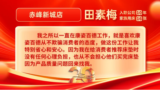田素梅還說(shuō)道:“我之所以一直在康姿百德工作,就是喜歡康姿百德從不欺騙消費(fèi)者的態(tài)度,做這份工作讓我特別省心和安心。因?yàn)槲以诮o消費(fèi)者推薦床墊時(shí)沒(méi)有任何心理負(fù)擔(dān),也從不會(huì)擔(dān)心他們買(mǎi)完床墊因?yàn)楫a(chǎn)品質(zhì)量問(wèn)題回來(lái)找我。今年是康姿百德成立20周年,我覺(jué)得公司能夠發(fā)展的越來(lái)越好、越來(lái)越壯大,離不開(kāi)認(rèn)真做產(chǎn)品,真誠(chéng)對(duì)待消費(fèi)者。希望我能在這么好的公司一直干到退休?!?/span>