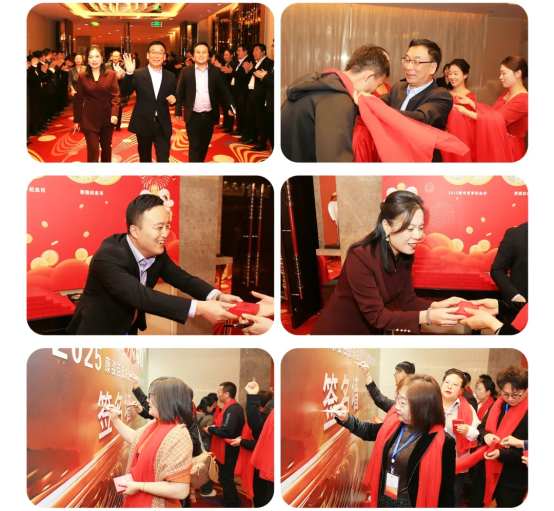 在璀璨燈光下,銷售精英們臉上綻放著溫暖的笑容。踏著紅毯,家人們意氣風發(fā)地邁向星光大道。公司領導將精心準備的伴手禮送到每個參會家人的手里,并給家人們戴上象征“鴻運當頭”的紅絲巾。簽名墻上龍飛鳳舞的每一筆都飽含豪情,攝影師鏡頭定格的每個笑臉都凝結著團隊榮耀的瞬間。