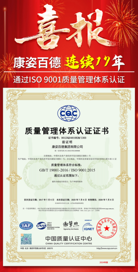 憑借過硬的質(zhì)量管理實力、完善的質(zhì)量管理體系、高效精細化的管理模式,康姿百德再次通過了ISO 9001質(zhì)量管理體系認證。這也是康姿百德連續(xù)17年通過該質(zhì)量管理體系的認證和再認證。