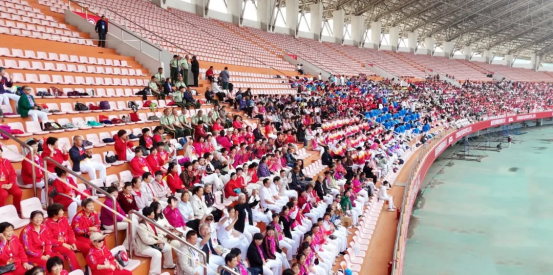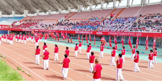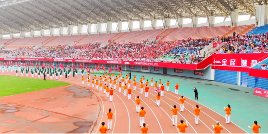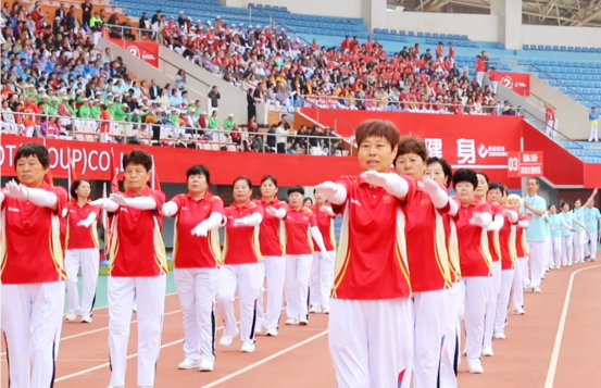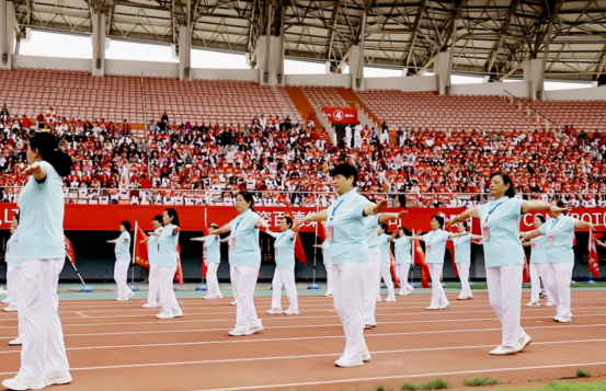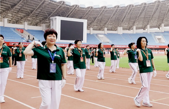 現場82支展演隊伍,浩浩蕩蕩、首尾相連,偌大的體育場瞬時變成一個律動的海洋。參賽隊員各個精神抖擻、熱情高漲,踏著康姿百德健身操音樂節(jié)拍,整齊劃一地舞動起來,贏得了全場觀眾的陣陣掌聲。