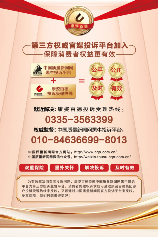 不僅如此,康姿百德還主動加入中國消費者協(xié)會“智慧315”消費維權投訴平臺,特邀“中國質量新聞網(wǎng)黑牛投訴平臺”作為第三方投訴監(jiān)督平臺,多重渠道并行,全方位保障消費者的合法權益。