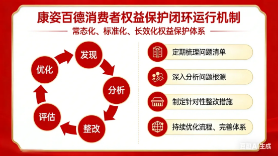 為確保消費者權益保護工作常態(tài)化、標準化、長效化,康姿百德構建了“發(fā)現(xiàn)—分析—整改—評估—優(yōu)化”的完整閉環(huán)運行機制,將權益保護融入企業(yè)發(fā)展的每一個細節(jié)。